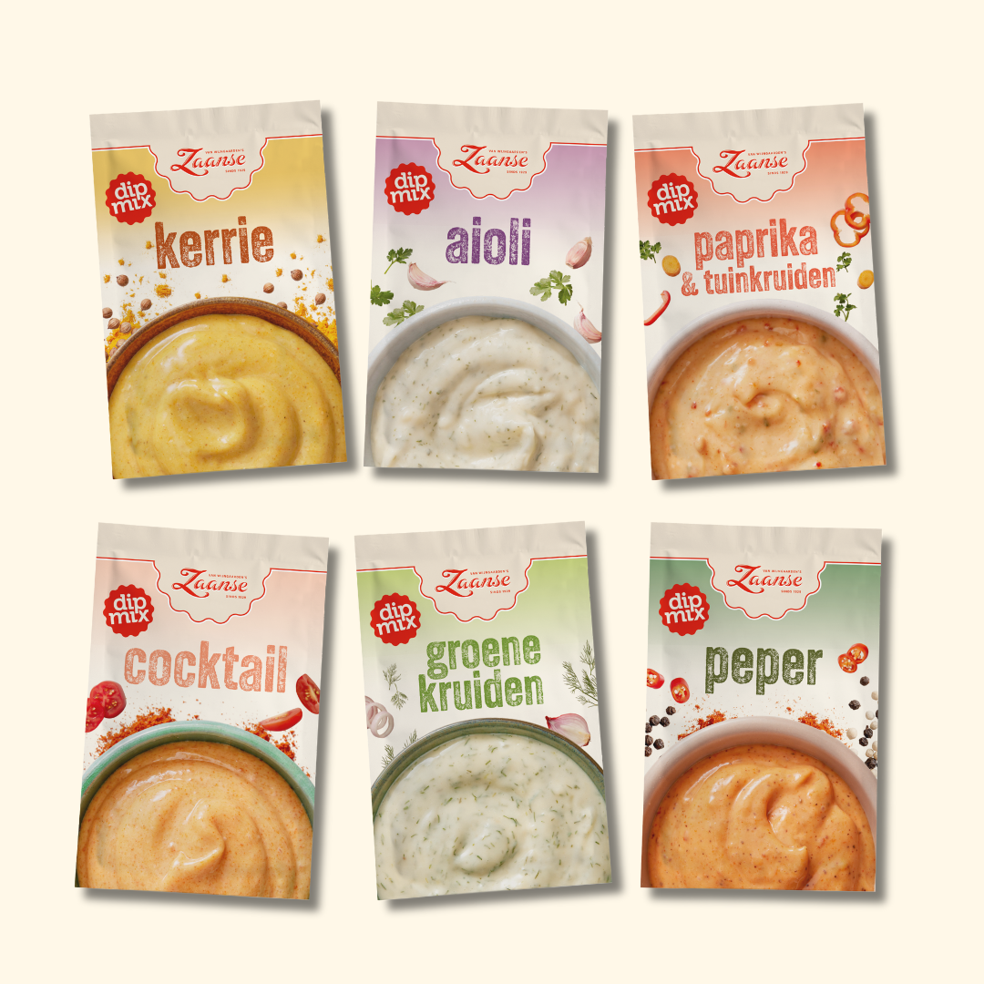 If you choose the Zaanse Dip Mixes, combined with Zaanse Mayonnaise, you can create a sauce to your liking in no time. With no fewer than six different flavors to choose from, there’s always a dip mix that perfectly suits your taste. Whether you prefer a fresh aioli, a spicy pepper, or a delicious paprika & garden herbs – we have it all!
